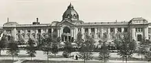 Following the example of the Petit Palais of the Exposition Universelle (1900), built from 1897 onwards, protagonists of the Düsseldorf artistic community in the Verein der Düsseldorfer Künstler and around Fritz Roeber, then secretary of the Kunstakademie Düsseldorf and from 1908 its director, longed for a building for representative art exhibitions in Düsseldorf. To this end, they organised themselves into an association in 1898, which was formally founded on 31 May 1900.[2] Fritz Roeber was unanimously elected chairman of the association, presiding over a board of 12 people.[3] The association's office initially resided in the Malkasten-Haus. By council resolutions of 21 February 1899 and 19 September 1917, the association was granted the privilege of holding art exhibitions in the Kunstpalast at any time.