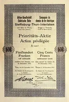 STI was formed in December 1911, originally as the Elektrische Bahn Steffisburg-Thun-Interlaken (English: Steffisburg–Thun–Interlaken Electric Railway),[3] and began carrying passengers on 10 October 1913, with the opening of a tram line between Steffisburg and Oberhofen (via Thun), which was later extended to Beatenbucht and finally to Interlaken. Plans for road rebuilding led to the closure of the Beatenbucht–Interlaken section of tramway in 1939, but trams continued to provide the Thun–Beatenbucht service, STI's main line, until 1952.[3] The Thun–Steffisburg tram line closed in 1958, and since then the STI network has been covered exclusively by buses. Trolleybuses, powered by electricity drawn from overhead wires, were used on the main line, Thun–Beatenbucht, connecting at Beatenbucht with the Thunersee–Beatenberg funicular and with a motorbus route covering the section to Interlaken.[3] In 1982, the trolleybuses were replaced with conventional, diesel-powered buses. STI introduced its first night service in 1993, between Thun and Bern called the Moonliner. Further extensions made to the network in 1999 and 2001 took STI buses into areas such as Gwatt, which had seen railway station closures. In 2022, STI moved headquarters to the Cremo building in Schwäbis.[4]