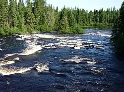 The Launay lake, located north-west of Galifet township, is the head of the Vermillon River. Down, the water flows through several rapids and falls and sometimes fellow a circuitous route in townships of Galifet, The Pottery, Dupuis and Picard. At the level of the dam of "Lac Brûlé" (Burned Lake) (formerly designated Vermilion-A), the Vermillon River turns northeast through the townships of Bisaillon, Olscamps and Payment, heading towards its mouth.[3][4] in its course the river flows prior to the southeast, then follows a segment 51.3 kilometres (31.9 mi) to the northeast and finally bifurcates at 90 degrees for the last segment of 8.5 kilometres (5.3 mi) flowing eastward to its mouth.[5]