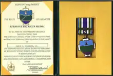 The Vermont Patriots Medal is an award of the state of Vermont. It is presented to the next of kin of each Vermont military service member who is killed in armed conflict. The award was first authorized in 1966, during the Vietnam War, but presentations did not commence until 1996.