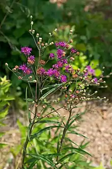 Vernonia texana is an erect herbaceous perennial. Its leaves are alternate and linear-lanceolate. It produces purple heads of flowers in the summer.[3]