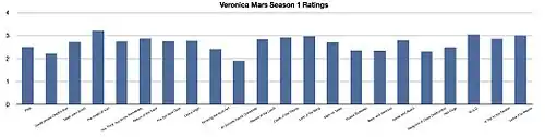 The series was critically acclaimed, and appeared on several fall television best lists.[2] The first season garnered an average of 2.5 million viewers per all 22 episodes in the US. Out of all regular primetime programming that aired during the 2004–2005 American television season, Veronica Mars ranked #148 out of 156, according to the Nielsen ratings system.[3] The pilot was watched by 2.49 million viewers,[4] while the finale was watched by 2.99 million viewers.[5]