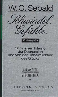 Vertigo (German: Schwindel. Gefühle., "Dizziness. Feelings.") is a 1990 novel and the first by the German author W. G. Sebald. The first of its four sections, titled 'Beyle, or Love is a Madness Most Discreet', is a short but conventional biography of Stendhal, who is referred to not by his pen name but by his birth name of Beyle. The second, 'All'estero', is a travelogue of two journeys made to the Alpine region by an unnamed narrator whose biography resembles Sebald's; an episode from the life of Casanova is also featured. The third, 'Dr K Takes the Waters at Riva', describes a difficult period in the life of Franz Kafka, referred to only as "Dr. K." Kafka's short story The Hunter Gracchus is re-told in summary form and the meaning of the hunter's ceaseless voyage interpreted by the narrator as Kafka's penitence for a longing for love. And the fourth, 'Il ritorno in patria', is a nostalgic recounting of the narrator's visit to his German hometown of "W," a rural village which he has seen nothing of for decades.[1][2] The narrator recalls one of the town's residents, Hans Schlag the huntsman, who, falling to his death, suffers the same fate as the huntsman in Kafka's short story. Sebald makes notable use of leitmotif, such as sensations of dizziness as suggested in the title, and deceased persons lying covered on platforms. The novel functions along with Sebald's subsequent works The Emigrants and The Rings of Saturn as a trilogy.[3] All three works were translated into English by Michael Hulse in partnership with Sebald.