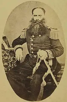 In 1856, Barrios married López's sister Inocencia, becoming a member of the country's social elite and brother-in-law to Francisco Solano López, who succeeded his father as president in 1862. After López's declaration of war on Brazil, Barrios was appointed supreme commander of the two army units of 5,000 men that invaded the Brazilian province of Mato Grosso from Alto Paraguay on separate routes from mid-December 1864.[1][2] The Mato Grosso Campaign by Paraguayan forces was of little strategic use to the country, but it brought in significant amounts of arms and ammunition, as well as tens of thousands of head of cattle and other loot.[3] Barrios also took the opportunity to enrich himself personally and had large quantities of stolen goods transported by ship to Paraguay for himself and his brother-in-law.