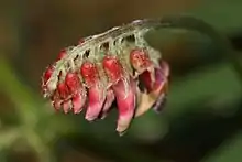 This vetch is a perennial herb with stout, hollow, and ridged climbing stems that may reach two meters in length. It attaches to objects and other plants by its large branched tendrils for support.[2] The leaves are made up of 9 to 13 pairs of lance-shaped or elongated oval leaflets that may measure up to 4 centimeters in length.[2] The inflorescence is a one-sided raceme of up to 15 or 20 flowers which have pale pink to dark reddish purple or sometimes yellowish to orange corollas. The flowers, each with a calyx about half as long as the corolla, are 1 to 2 centimeters long. They yield fruits which are legume pods measuring up to 4 centimeters long by 1.5 wide. As they dry they turn black.