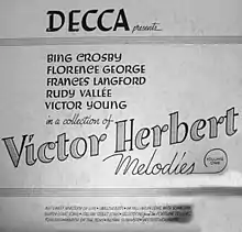 Victor Herbert Melodies, Vol. 1 is a studio album featuring five 78 rpm phonograph records recorded by artists Bing Crosby, Frances Langford, Florence George and Rudy Vallee celebrating the music of Victor Herbert. The recordings were made in December 1938 by Decca Records, who were probably aware that a film called The Great Victor Herbert was being made by Paramount Pictures.[1] Victor Young and His Orchestra provided the musical accompaniment to all of the tracks. The album was followed by a sequel Victor Herbert Melodies, Vol. 2