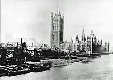 A private scheme to rebuild the area south of the gardens was discussed in Parliament in 1898 in the Victoria Embankment extension and St John's Improvement Bill,[4] and was rejected because it did not include extending the Gardens.[5] London County Council then brought forward its own scheme for widening Millbank, extending the Thames embankment and enlarging the open space southwards to Lambeth Bridge. The Commissioners of Works were expected to give up a small part of the existing Gardens for the road widening, and, in order to honour the promise to Smith, insisted that it be expressly provided in the Act authorising the scheme that the new land between Millbank and the river be laid out as a garden.[6] Consequently the London County Council (Improvements) Act 1900, which authorised the scheme, provided that the new land between Millbank and the Thames should be "laid out and maintained ... for use as a garden open to the public and as an integral part of the existing Victoria Tower Garden".[7] The new land was laid out as a garden in 1913-14 and opened to the public on 30 June 1914.[8]