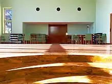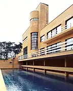 The entrance of the estate is situated in the north-west corner of the terrain, displaced in relation to the main facade of the building. A round driveway enabled the cars to reach the garage, located in the caretaker's lodge, without having to manoeuvre.[3] The villa introduce itself as yellow brick shell and it is the only realisation of Mallet-Stevens to have a similar frame. The French firm Bonzel produced twenty-six moulds of different form in order to make bricks capables to cover the diverse areas of the villa. The source of inspiration of this brick is the town hall of Hilversum, in the Netherlands, realized by the architect Willem Marinus Dudok.[2] If the aesthetic canon of the villa is resolutely modern (large glass windows, flat-roofs, total absence of decoration, purity of lines), its plan is in line with the French tradition of the 17th- and 18-century châteaux: two symmetrical wings (the parents' wing and the children and household staff wing) evolve around the central corp of the villa, constituted by the vestibule and the hall salon.[4] The plan of the villa is designed to facilitate the displacements and to organise the domestic life in a rational way. In the ground floor, the vestibule is a vast room used to distribute the spaces. The black door that opens to the hall-salon is framed by a pair of light boxes which look like those that Mallet-Stevens designed for the set of Marcel L'Herbier's movie Le Vertige. The hall-salon is a big double-height cubic room with a large glass window overlooking the park. The floor is covered with parquet and the walls are painted green. On the east side is situated the fireplace alcove wrapped in yellow Siena marble and set up with leather banquettes. Thanks to a sliding door situated on the west side one can reach the parents' dining room, which is characterised by the walls and the floor in green Swedish marble and the black lacquered pear wood furniture. Adjoining to the parents' dining room, the children's dining room is furnished with a table and six chairs in zebrawood (originals). This room has an independent access to the garden thanks to the exterior corkscrew stairs. from the two dining rooms one can gain access to the pantry and the kitchen. This spaces demonstrate the importance of hygiene in the conception of a modern house by Robert Mallet-Stevens as it is shown by the presence of a metal furniture, easy to clean, the black-and-white chequerboard floor and the walls covered with white tiles bringing additional luminosity. Still in the ground-floor, in the east wing, Paul Cavrois' study, furnished with varnished natural pear wood, give access to the smoking-room, a little circular room calling to mind a cabin of a liner that is provided with a cigar and alcohol cabinet in natural Cuban mahogany and leather bench seats. The east end of the ground-floor is occupied by the two young men's rooms, one with an intense and living polychromy of the walls, a tribute to the Dutch artistic movement De Stijl, and the other one with the walls painted in different shades of yellow and the furniture in black-and-white ceruse oak wood.