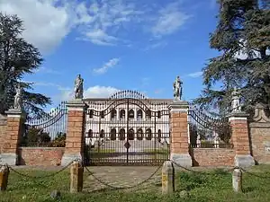 The villa is located in an irregular plot surrounded entirely by a wall; the main facade is positioned to the south and access to the property has a large gate, on the sides of which are two pillars surmounted by statues, which opens onto an avenue to the entrance.[2] The villa is arranged with loggias on three sides.[1]
