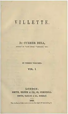 Villette was Charlotte Brontë's third and last novel published during her life. It was preceded in writing by The Professor (her posthumously published first novel, of which Villette is a reworking, though still not very similar), Jane Eyre, and Shirley.