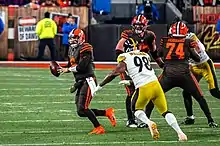 He started in the Pittsburgh Steelers’ season-opener at the Cleveland Browns and collected a season-high 12 combined tackles (four solo) during their 21–21 tie. Williams was inactive for the Steelers’ Week 5 victory against the Atlanta Falcons due to a hamstring injury. This became his first missed game of his five-year career.[16] On November 8, 2018, Williams made four combined tackles, one pass deflection, one sack, and returned an interception for his first career touchdown during a 52–21 win against Carolina Panthers in Week 10. Williams intercepted a pass by Cam Newton, that was intended for wide receiver Devin Funchess, and returned it for a 17-yard touchdown during the first quarter.[17][18] Williams was inactive for the Steelers’ Week 17 victory against the Cincinnati Bengals due to a foot injury.[19] Williams finished the season with 76 combined tackles (50 solo), 4.5 sacks, two pass deflections, one interception, and one touchdown in 14 games and 14 starts.[14] He received an overall grade of 65.7 from Pro Football Focus, which ranked as the 41st best grade among all linebackers in 2018.[20]
