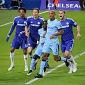 Kompany was handed the number 4 jersey for the 2010–11 season after previous wearer Nedum Onuoha moved on loan to Sunderland. On 25 April, Kompany again continued to captain the side in the absence of striker Carlos Tevez against Blackburn Rovers at Ewood Park, playing the full 90 minutes alongside Lescott in a 1–0 victory.[21] On 16 April, Kompany captained Manchester City's victory over main rivals Manchester United in the FA Cup semi-final at Wembley Stadium; City won the game 1–0.[22] Later that day, he was named in the PFA Team of the Year alongside teammate Tevez.[23]