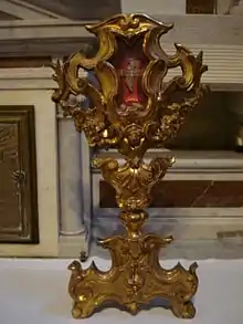 On February 6, 1769, a small bone relic of San Vincenzo was sent to Craco from Rome. Then in 1792, Fr. Prospero, a Franciscan from Craco, finding himself in Rome, and wishing to return home with a relic of some glorious martyr, obtained from Pope Pius VI, through the Sacred Congregation of Rites, a relic which was said to be that of a Roman soldier as well as a glorious martyr, by the name of Vincenzo – a name signifying "winner" or "conqueror." The "sacred body with a flask of blood" of San Vincenzo Martire was exhumed at the cemetery of St. Ciriaca, in Rome. Fr. Prospero enclosed the precious relic in an artistic crystal-sided casket. Inside the casket was set the waxen body of the martyr, dressed as a Roman soldier and lying in a reclining position.