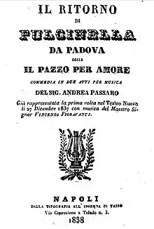 - ↑ The title had several variations. For performances outside Naples the character "Pulcinella" was generally replaced with "Columella".