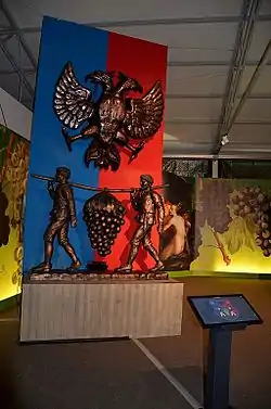 Statues of the messengers, symbols of Poysdorf. Interactive coat of arms in the Hall of Grapes.