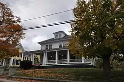 The Viola Coombs House stands on the north side of Main Street (Maine State Route 125), a short way east of its junction with Center Street and Back Hill Road. It is set between the Italianate Robert P. Carr House (to its left), and the Second Baptist Church (to its right). The Coombs House is a two-story wood-frame structure, roughly rectangular in plan, with a hip roof pierced on its front face by a hipped dormer. The roof has extended eaves, particularly over the front right corner of the house, which is clipped to an angle; the eaves are studded with decorative brackets. The dominant feature of the house is its porch, which extends across the front and around the right side. Its roof is supported by bulky Tuscan columns, with a balustrade of turned spindles. The main entrance is framed by sidelight and transom windows, with slender Tuscan columns flanking its outer edges. The interior features high quality period woodwork that is largely unaltered.[2]