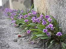 As a violet, its trumpet-shaped flowers have five petals and bilateral symmetry. The lowermost petal is often the smallest, and all petals are typically a rich purple hue, though this can vary due to local conditions or localized mutations, and in some varieties deliberately bred for differing appearance.