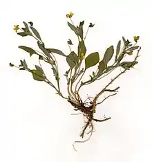 Viola tomentosa is a species of violet known by the common names feltleaf violet and woolly violet. It is endemic to the central Sierra Nevada of California, where it occurs in various types of dry mountain forest habitat. This small herb grows from a deep taproot, reaching a maximum height of 5 to 10 centimeters. The herbage is coated with woolly hairs. The leaves have oval blades borne on petioles a few centimeters long. A solitary flower is borne on a short upright stem. It is under a centimeter long with five yellow petals. The lower three petals are veined with dark brown and the upper two are stained brown or purplish on the back sides.