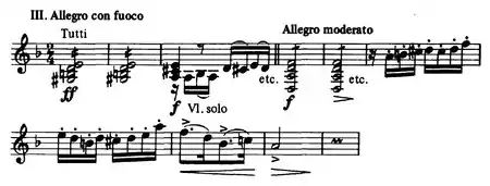 - A rhapsodic passage marked Allegro con fuoco and mainly a solo cadenza, leads to the finale, a dashing rondo in the Gypsy style, which quotes the first movement's subsidiary theme in the course of its second and third episodes. The final movement implements a 2/4 time, which allows the violinists to emphasize certain notes in the beginning of some measures.