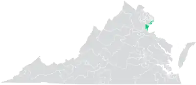 The district overlaps with Virginia's 1st, 8th, and 11th congressional districts, and with the 2nd, 28th, 31st, 42nd, 43rd, 44th, 51st, and 52nd districts of the Virginia House of Delegates.[4] It lies directly across the Potomac River from the state of Maryland.[1]