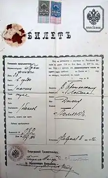 Under a decree of 1894, foreigners visiting Russia were to be given special passports, which were issued at Russian diplomatic missions and consulates, or to have their foreign passports confirmed there, by official seal.