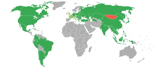 - ↑ "List of Countries and Regions without Visa - THE EMBASSY OF MONGOLIA TO THE SWISS CONFEDERATION AND THE PERMANENT MISSION OF MONGOLIA TO UNITED NATIONS OFFICE AT GENEVA AND OTHER INTERNATIONAL ORGANIZATIONS". embassyofmongolia.ch. 30 March 2023.