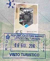 When visiting San Marino, there is no passport control, hence no passport stamps are issued. However, visitors may get souvenir passport stamps at a state tourism office, which is considered by the authorities to be the official stamp.[4]