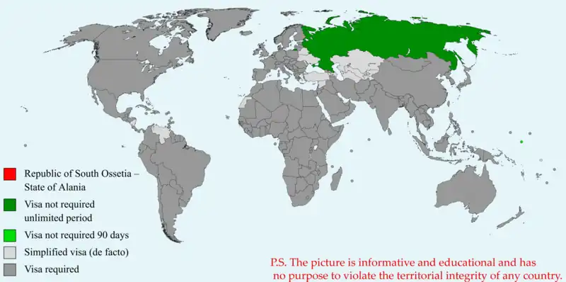 South Ossetia does not issue visas. However, visitors are required to receive approval from the South Ossetian government in advance of their visit unless they are citizens of exempt country. South Ossetia may only be entered through Russia. Visitors are required to hold a valid Russian visa that permits them to return to Russia unless they are Russian citizens or citizens of countries that are exempt from Russian visa requirements.[1]