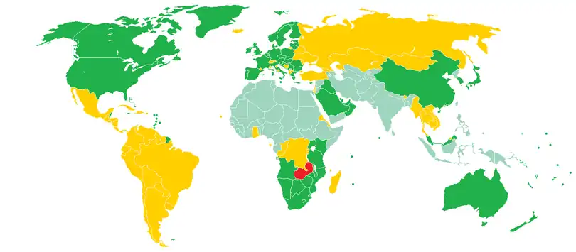 Visitors to Zambia must obtain a visa from one of the Zambian diplomatic missions, unless they come from one of the visa exempt countries or countries whose citizens are eligible for visa on arrival. Visitors may alternatively obtain an electronic visa.[1] All visitors must hold a passport valid for at least 6 months. As of November 2014, Zambia and Zimbabwe also offer a universal visa.[2]