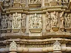 The north and south walls of the temple feature erotic reliefs.[15][20] The junction of the vestibule and the sanctum features a variation of the famous "acrobatic sex" sculpture at the newer Kandariya Mahadeva temple. Like the Kandariya sculpture, this one also features a couple supported by two women, but in this sculpture, the man is on the top. The woman at the bottom fingers the woman on the left with one hand, while her other hand rests on the ground for support. Some sculptures feature men indulging in bestiality, as women cover their eyes.[19]