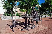 The plaza has a statue of a man playing chess.[5] The city selected an artist to paint a mural on the side of one of the buildings neighboring the plaza in 2019.[6][7][8]