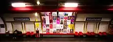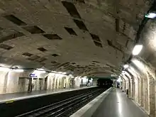 From the 1950s, like most stations along the line, the platforms were modernised with the installation of red metal casings and golden advertising frames on the walls until 2015, when it was removed as part of the "Un métro + beau" programme by the RATP.[1] It consisted of modernising the platforms by improving lighting, signages, as well as returning the characteristic beveled white tiles of the Paris métro to the station, thereby restoring the platforms to its original "Nord-Sud" decoration, while the station remained open.[2][3] The new tiles were installed by May 2018, with all work completed by March 2019 after several delays and technical difficulties.[4][5]