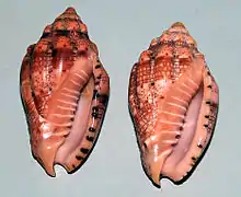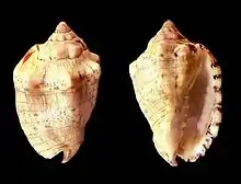 Dorsal (left) and ventral (right) views of a shell of Voluta musica