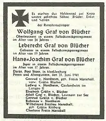 Obituary for the von Blücher brothers, German newspaper, June 1941