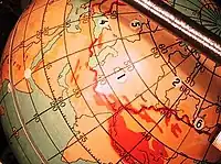 At least one Voskhod IMP's globe was customized with white paper bullets numbered from 1 to 8, along with unnumbered bullets.[14] Those relate to radio communication centers linked with Mission Control in Moscow. The unnumbered bullets refer to space control-monitoring ships.[14][15]