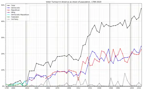 U.S. presidential election popular vote totals as a percentage of the total U.S. population. The black line is the total turnout, while colored lines reflect votes for major parties. This chart represents the number of votes cast as a percentage of the total population, and does not compare either of those quantities with the percentage of the population that was eligible to vote.[3]