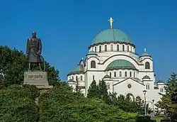 In 1906, an architectural design competition for the future church was announced. Saint Petersburg Academy of Sciences was authorized to judge the project, and it rejected all five applications as not being good enough. A series of wars followed (First Balkan War in 1912, Second Balkan War in 1913, World War I in 1914-1918), which stopped all activities on the construction of the church.[9] Plans were also made to erect a Monument to the Third-Class Reservists in 1914, but due to the outbreak of World War I, the monument was erected on 29 July 1923. After the war, additional monuments were erected in the park. Since in 1916 the Austro-Hungarian forces demolished the Karađorđe monument in Kalemegdan, built in 1913, it was proposed after the war that new monument should be built in the park, close to the tombs of his comrades-in-arms. Also, after the war, the park got its present name.[10] A Monument to French poet Alphonse de Lamartine was erected in 1933 in the park.