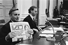 Minister Frits Korthals Altes with the Vrij Nederland (19 May 1983) at the Tweede Kamer, next to him Onno Ruding. Both are linked by Vrij Nederland Slavenburg's bank affair.
