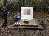 In 1993, Sara Tregerman-Ryterski (1917-2011), whose father and brothers were murdered in the massacre, built a monument (51°17′44″N 22°09′35″E / 51.2955°N 22.1597°E / 51.2955; 22.1597) at the cemetery to commemorate the event. The monument contains inscriptions in Polish and Hebrew. The Polish inscription is a dedication to the eternal memory of the victims and to one of the men who raised from the bodies around him, pleaded to spare his life and in return was shot dead. The inscription in Hebrew is a dedication to the victims of the Tregerman family, whom she carried and buried in the cemetery: Her father David and her brothers Abraham Hirsch, Refael Mordechai and Pesach Noah.