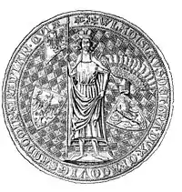 When Przemysł II was still alive Władysław I Łokietek married Jadwiga, daughter of Bolesław the Pious. There are three main theories among historians as to when the wedding took place. The most historic assumes that the marriage took place during the life of Jadwiga's father, and so no later than 1279.[19] The second theory, which now has the most supporters, is that the wedding took place between 1290 and 1293, possibly at the conclusion of the meeting in Kalisz in January 1293, and that in 1279 there was perhaps only an engagement (matrimonium de futuro).[20] The third theory posits a specific date of the marriage as 23 April 1289.[21]