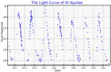 W Aquilae is a variable whose brightness oscillates between magnitude +7.3 and +14.3 over a period of 490.43 days. In Mira variables (which are named after Mira, the prototype), this instability comes from pulsation in the stellar surface, causing changes in color and brightness. W Aquilae, a Mira variable, shows silicon monoxide maser emission.[13]
