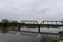The Wabash Railroad Bridge is a historic structure located south of Pella, Iowa, United States. It spans the Des Moines River for 561 feet (171 m).[2] The Des Moines and St. Louis Railroad (D&S) was built through the central part of Marion County in 1882. This bridge was probably built at that time.[2] It is a three span, wrought iron, Pratt through truss manufactured by the Carnegie Steel Company. The Wabash, St. Louis and Pacific Railroad, the Wabash Railroad, eventually acquired the D&S and this bridge. It remained in use as a railroad bridge until about 1946 when the county acquired the bridge and the right-of-way for a county road. They rehabilitated it in 1951, replacing part of the substructure. The bridge was listed on the National Register of Historic Places in 1998.[1]