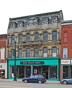 Wagner's Block is a three-story Second Empire commercial building with a mansard roof. It has a heavily ornamented cast iron and limestone facade, with oval windows set into the slate covered mansard roof. Below, windows on the second and third stories are flanked by engaged Corinthian columns supporting heavy window hoods. A balcony projects from the third floor. The facade of the first floor has been modernized with large panes of glass.[2]