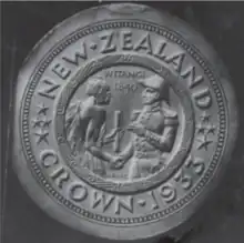 While various foreign silver coinage was used in its initial period of colonisation, British silver coins became dominant following the confirmation of the pound sterling as the sole legal tender in 1858, alongside various locally issued copper tokens.[3] Although never a legal tender, the introduction of the Australian pound led to the occasional circulation of Australian coinage, accelerated by the Great Depression. By 1931, an estimated 30%-40% of circulating coins in New Zealand were Australian. The devaluation of the New Zealand pound relative to the pound sterling led to mass currency smuggling and coin shortages.[4] The Coinage Act, 1933, allowed the issue of independent coinage of the New Zealand pound. The act set out weight and purity specifications for six denominations of silver coinage, requiring all coinage to be produced at 50% silver by weight.[5] Although the crown was among the denominations listed in the act, the Royal Mint minted only the five smaller denominations for 1933 and 1934. No design was proposed for a crown denomination during the initial selection process. Any future crown issue were defined as a coin with a diameter of 1.525 inches, and a weight of 28.27 grams.[6] Like other New Zealand silver coinage, the rim of the coin was milled.[7]