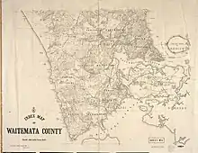 The county was established in 1876, after the abolition of the Auckland Province, and was one of the largest counties created in New Zealand.[1] The county replaced the only previous local government system, which was a series of local road boards, which were established from 1862 onwards.[1] The county was split into six ridings: Ararimu, Manukau, Takapuna, Titirangi, Waitakerei and Weiti. The County Council offices were located at the corner of Emily Place and Princes Street in Auckland, and from February 1923 until 1963 shred the office with the Manukau County Council.[2] From 1967, the council moved to 68 Greys Avenue in Auckland.[3][4]
