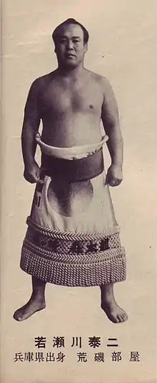 Wakasegawa Taiji (若瀬川泰二」を編集中, real name Tadao Hattori, 20 February 1920 – 3 September 1993) was a sumo wrestler from Amagasaki, Hyōgo Prefecture, Japan. He made his professional debut in 1935, reaching the top makuuchi division in 1942. His highest rank was komusubi. He was twice runner-up in a tournament and earned seven gold stars for defeating yokozuna and four special prizes. He retired in 1959 at the age of 38 and became an elder of the Japan Sumo Association, working as a coach at Isegahama stable until his mandatory retirement in 1985.