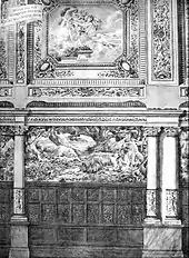 One of its early residents was Benoît-Constant Coquelin who carried on correspondence with Henry Irving[12] and Lillie Langtry from his residence there.[13] In 1898, the hotel opened a new dining room[14] which was in the house which the Isthmian Club operated for many years[15] at 105 Piccadilly.[16] Lord Walsingham hired artist Cesare Formilli to complete the decoration of the new dining room, based upon designs that had been presented the previous year at the Paris Salon. Formilli selected the interior furnishings specifically for the room and surrounded it with columns featuring bas-reliefs of dancing girls. On the walls and ceilings were nine frescos, featuring hunting and fishing scenes.[17]
