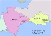 22 October 1549 at Colyton,[24] he married Mary Wyke, the third of four daughters and co-heiresses of Richard Wyke of Bindon in the parish of Axmouth, Devon, three miles south-east of Colcombe. Richard Wyke was a great-grandson of Roger Wyke (died c. 1467) (alias Wykes, Wycke, Wick, Wicks, Weeke, etc.), a Member of Parliament for Plympton Erle,[25] Devon, in 1413, a younger son of William Wyke of North Wyke in the parish of South Tawton in Devon. Richard Wyke died without sons, leaving four daughters and co-heiresses. Mary's share of her paternal inheritance included Bindon and a moiety of her father's larger estate at Charborough in Dorset. Erle re-purchased the other moiety from Alice Wykes, Mary's elder sister, and made it his principal residence.[14] By his wife he had children as follows: