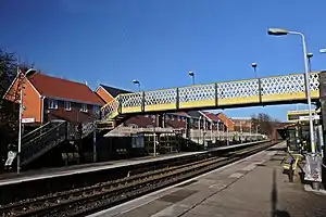 The station ticket office is staffed throughout the hours of service each day, closing shortly after midnight. At platform level, there are shelters on each side, information screens and timetable notice boards. Automated announcements are also used to convey train running information. Step-free access is only possible from the car park to the southbound platform, as access to the ticket office and via the footbridge to the northbound platform require the use of stairs.[2] There is car parking for 10 vehicles and secure storage for 10 cycles.[3] During November 2018 the height, width and layout of the platforms were adjusted to prepare for Merseyrail's new fleet of trains which are due to be introduced from 2020.[4]