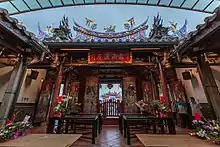 Inside the temple, there are twelve historical wooden plaques (bian'e) that are protected by the city.[1] Most notably, there is one that dates from 1732 carved with the words Fúyīn Chuántái (福蔭全臺, lit. "blessings across all of Taiwan"). The plaque was gifted to the temple by Peng Chao-gui (彭朝桂), a Qing military official, and is the oldest surviving plaque in Taichung.[3]